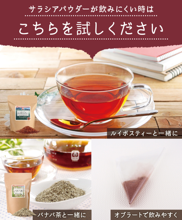 サラシアだけでは飲みにくい方は、バナバ茶などのお茶と一緒に飲んではいかがですか?目的に合った組み合わせをおすすめします!