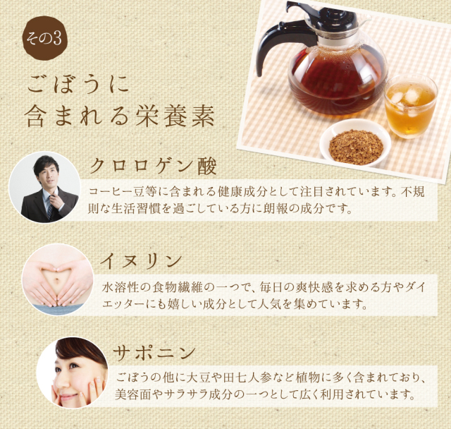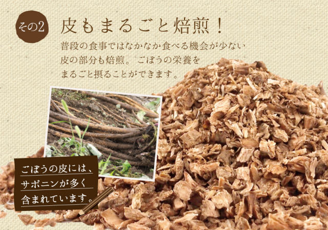 〇サポニンが含まれる皮部分もまるごとお茶に!クロロゲン酸、イヌリンなど生活習慣が気になる方や女性に嬉しい成分も!飲みやすい味でお食事にもよく合います。焙煎された香ばしいごぼうの香りをお楽しみください。