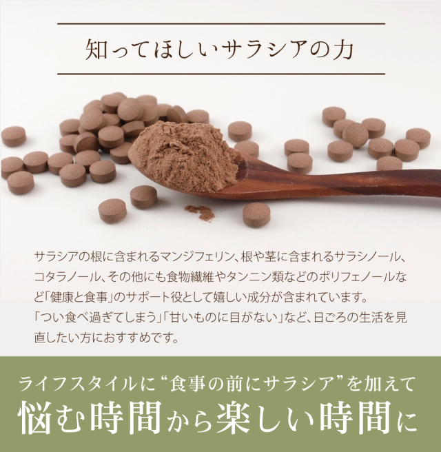 〇サラシアの根に含まれるマンジフェリン、根や茎に含まれるサラシノール、コタラノール、その他にも食物繊維やタンニン類などのポリフェノールなど「健康と食事」のサポート役として嬉しい成分が含まれています。「つい食べ過ぎてしまう」「甘いものに目がない」「毎日スッキリしたい」「肌の調子が気になる」など、日ごろの生活を見直したい方におすすめです。健康・野草茶センターのサラシア粒はインド原産の「サラキア・レティキュラータ」(通称サラシア)の根のみを使用。錠剤にするために使用している硬化ヒマシ油はトウゴマの種子から作られています。“サラシア本来の栄養になるべく影響しない”、そして“毎日取り入れるから少しでも安全性の高いもの”を第一に考え選びました。